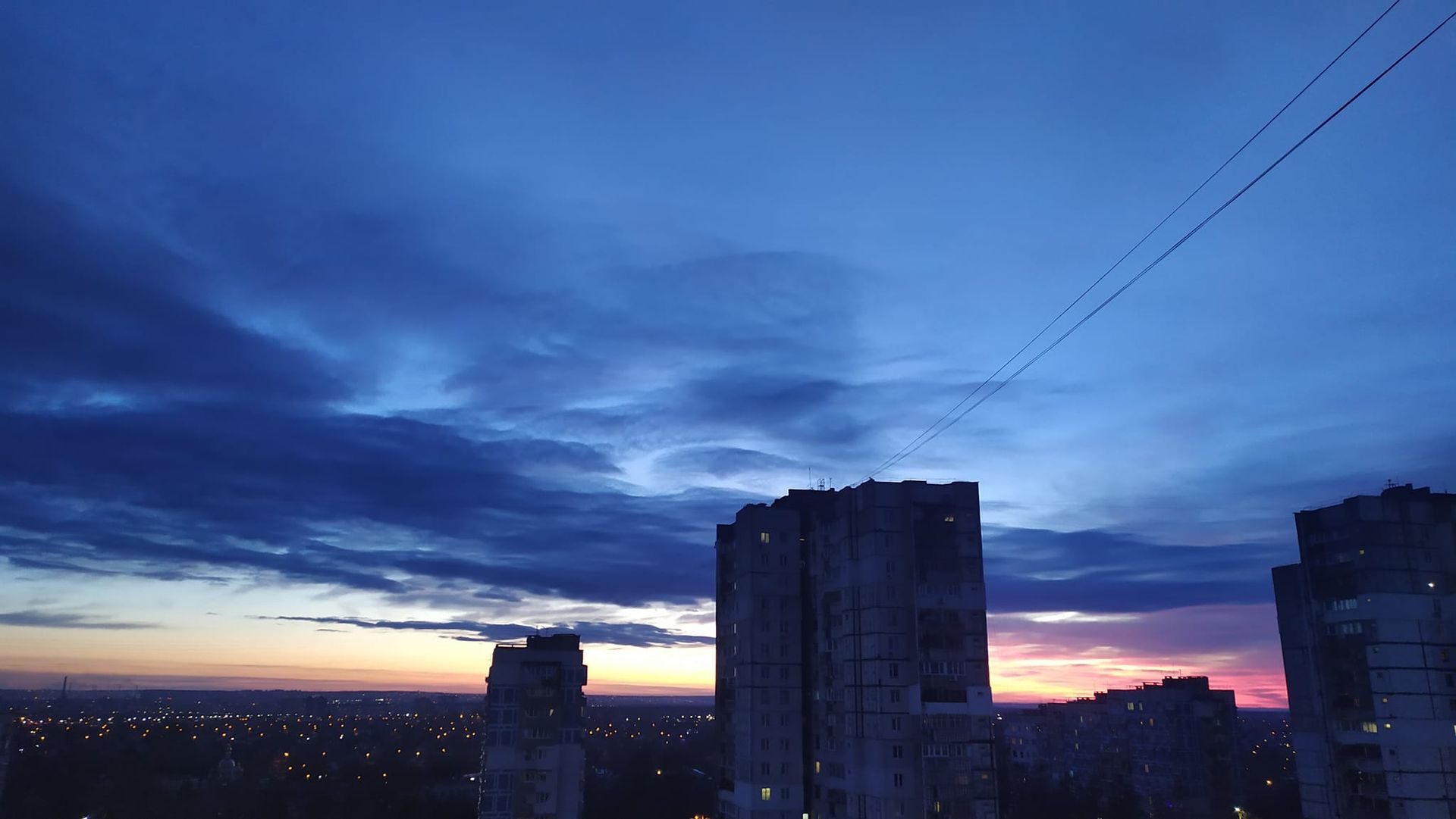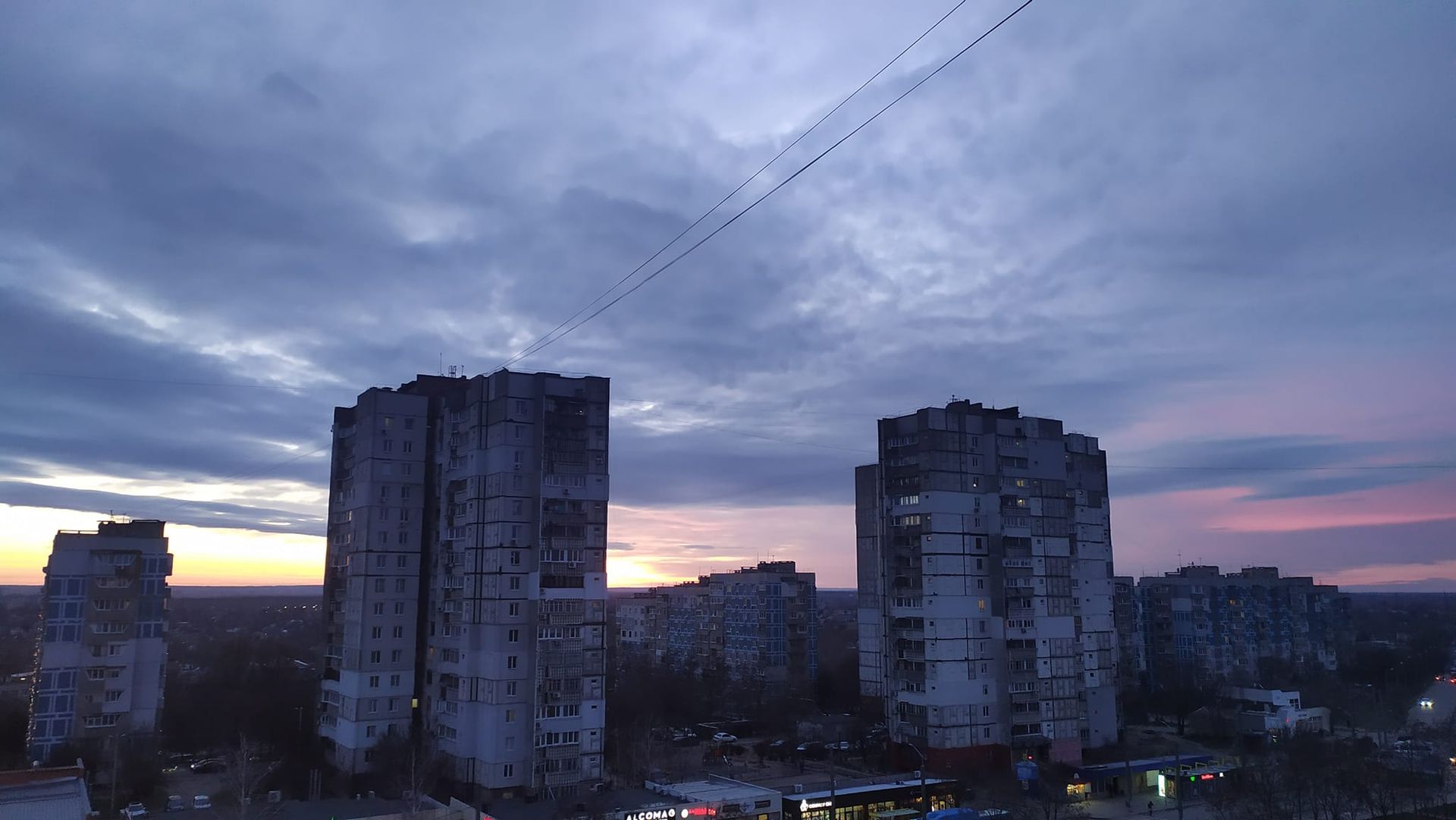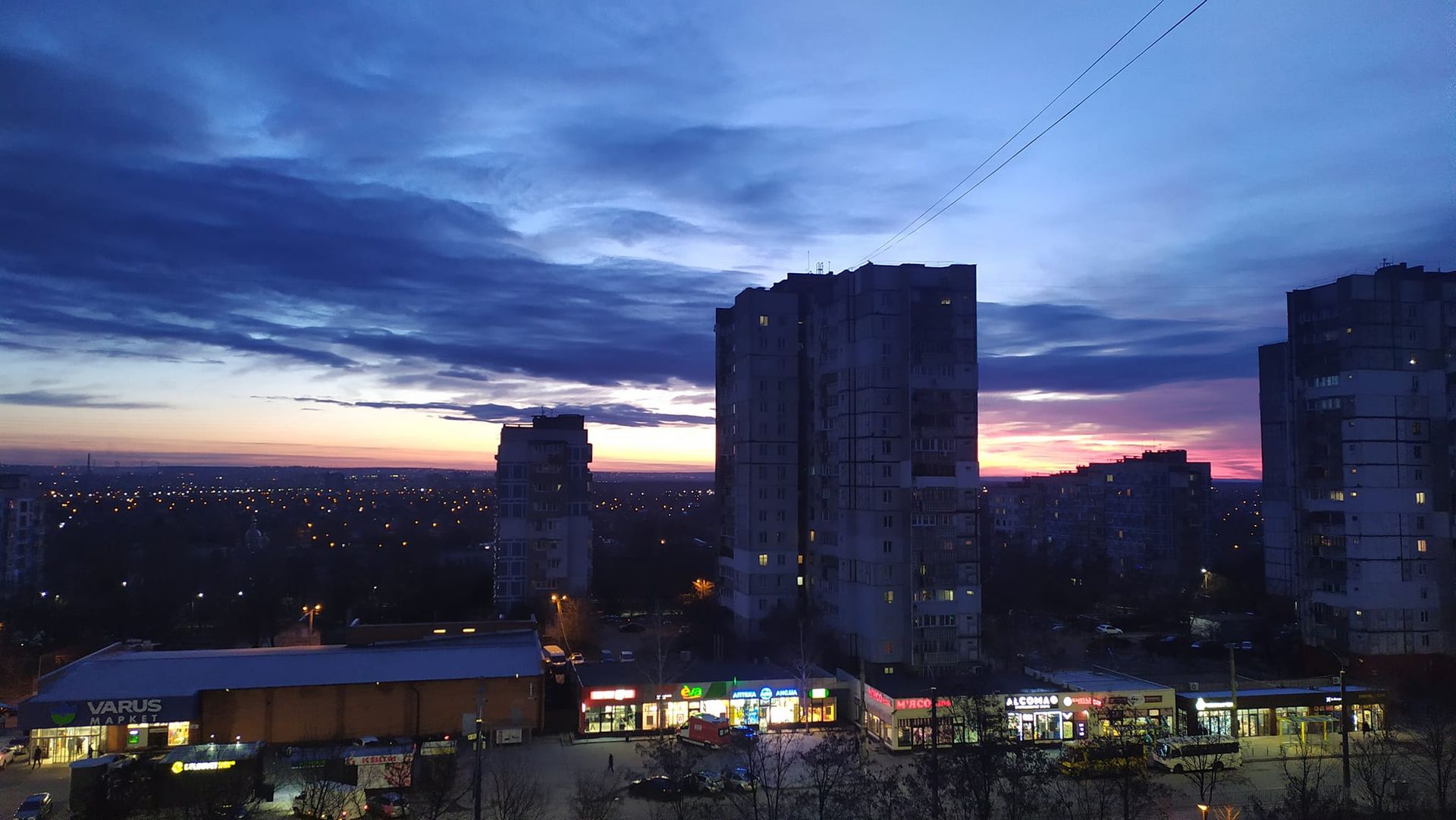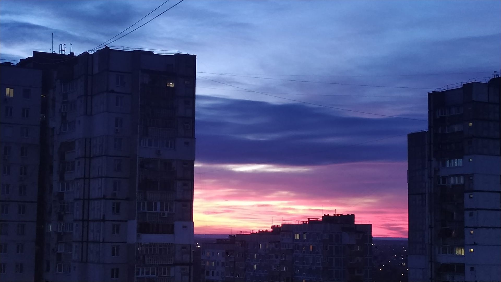 Небо забарвилося у пурпурний колір всього на декілька хвилин. Подекуди горизонт скрасився у рожевий колір, який плавно переходив у фіолетовий. Однак всього за декілька митей сонце остаточно сховалося за обрієм й Дніпро накрила темрява.