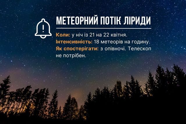 Як повідомили в Дніпровському планетарії, у ніч з 21 на 22 квітня, містяни теж зможуть побачити метеоритний дощ Лірид. Скоріше за все, такого як в Києві не буде, але за ясної погоди за цим явищем можна спостерігати неозброєним оком.