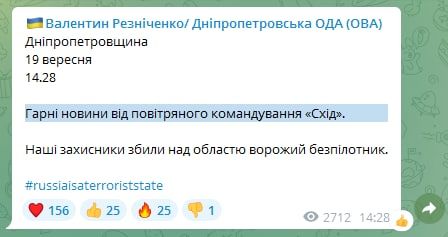 Гарні новини від Повітряного командування Схід. Наші військові збили над областю ворожих безпілотник, - зазначив він.