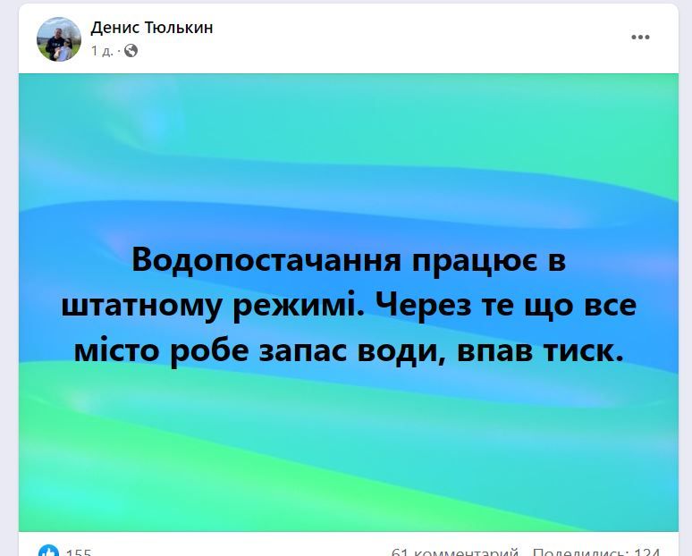 Друзі, вмикаємо режим жорстокої економії води. Як питної так і технічної. ОВА працює з АТБ щодо завезення додаткових об'ємів питної води в магазини мережі на території району. Хто має можливість - продовжуйте робити запаси води, - написав він.