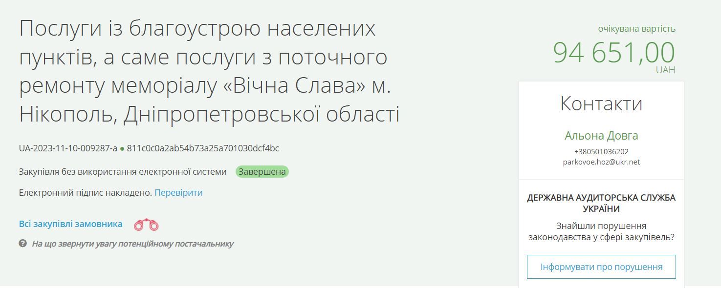 Як йдеться в описі тендеру, шукали компанію, яка може надати послуги із благоустрою населених пунктів, а саме послуги з поточного ремонту меморіалу "Вічна Слава" у Нікополі на вулиці Херсонській.