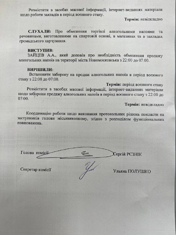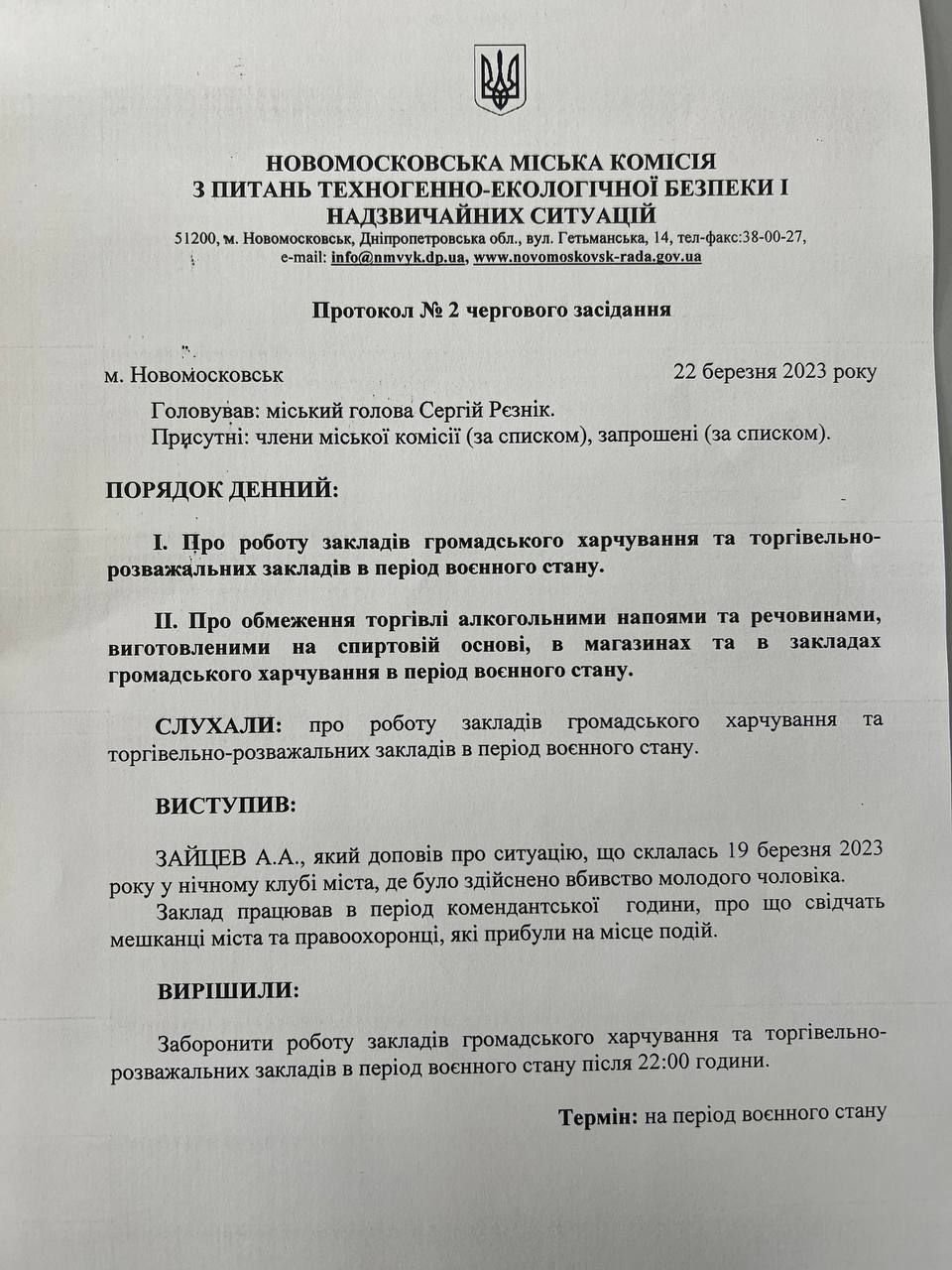 Тепер усі розважальні заклади у місті мають завершувати свою роботу о 22:00, тобто за годину до настання комендантської години. Крім того, на період воєнного стану у Новомосковську заборонено продаж алкогольних напоїв з 22:00 до 7:00.