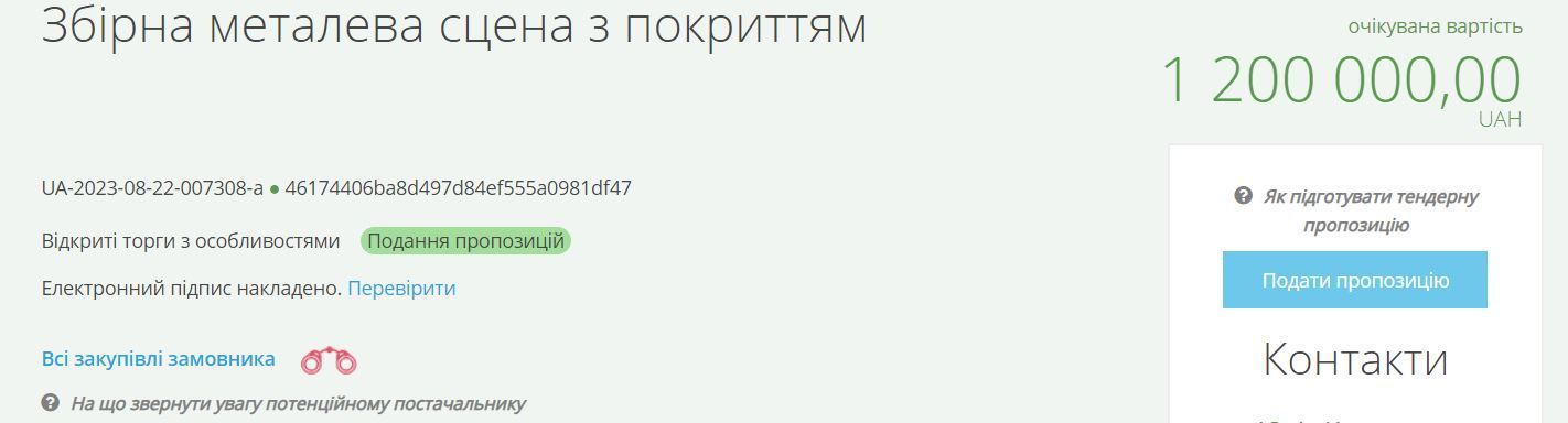 Так, на сайті закупівель Prozzoro з'явилися тендери від управління культури, спорту та туризму міської ради Новомосковська про покупку збірної металевої сцени за 1,2 мільйона гривень, а також про монтаж цієї конструкції за 509 тисяч гривень.
