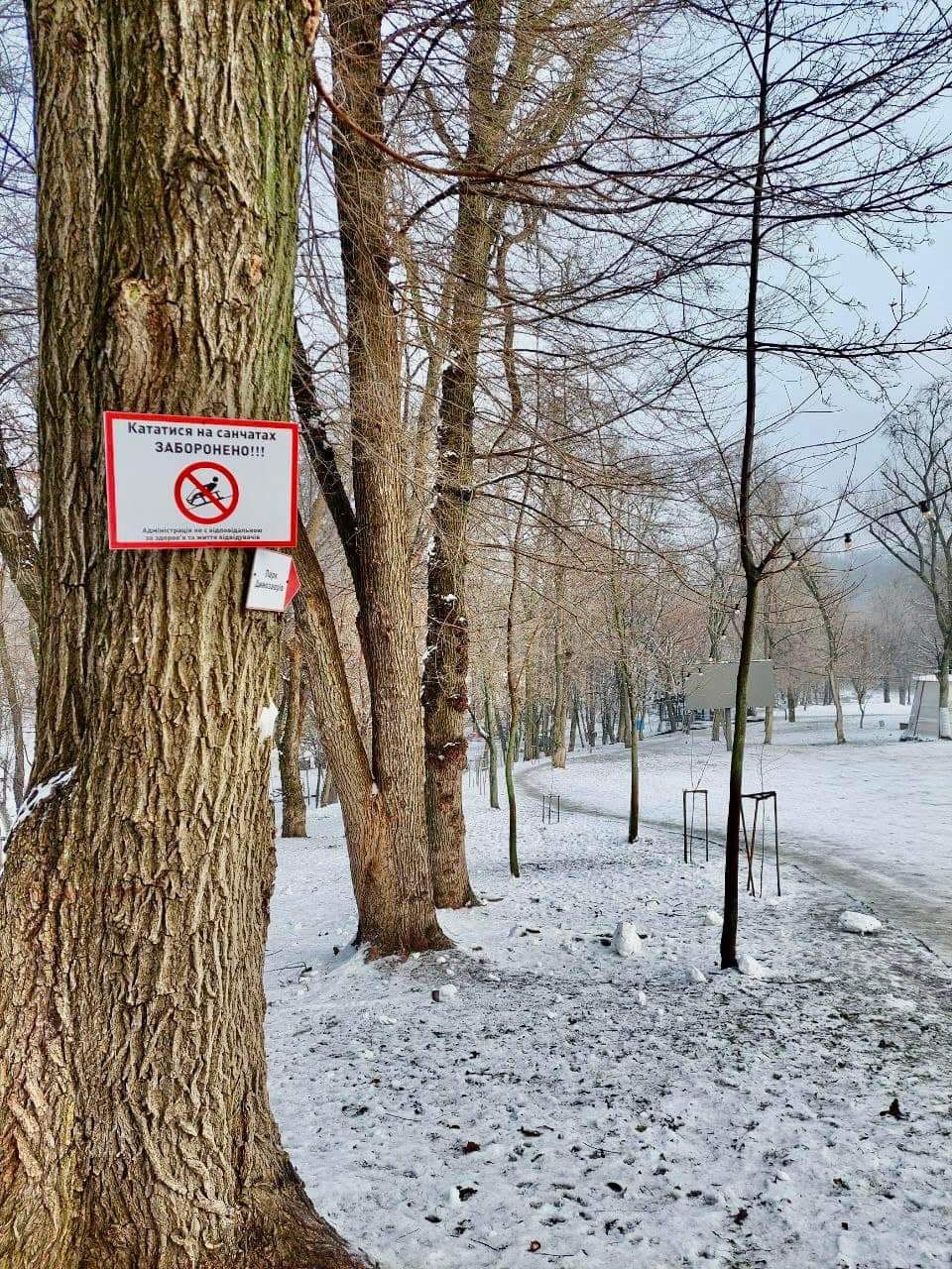 Як зазначили в профільному департаменті міськради, у парках Дніпра заборонено кататися на санчатах чи лижах. Сьогодні випав сніг, тому комунальники розвісили на деревах попереджувальні таблички.