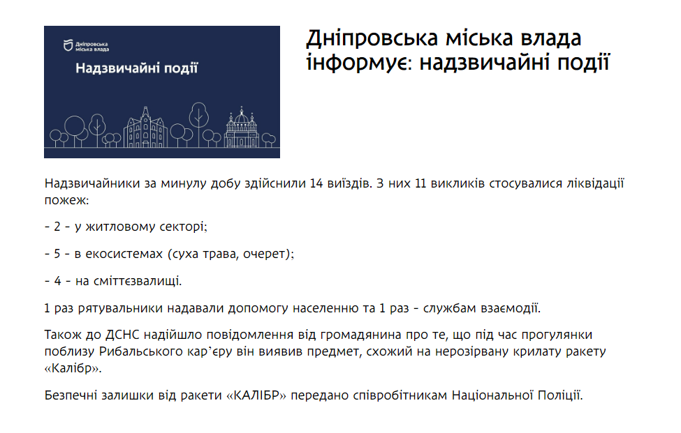 У неділю, 31 березня, до ДСНС надійшло повідомлення від громадянина про те, що під час прогулянки поблизу Рибальського кар’єру він виявив предмет, схожий на нерозірвану крилату ракету «Калібр».
