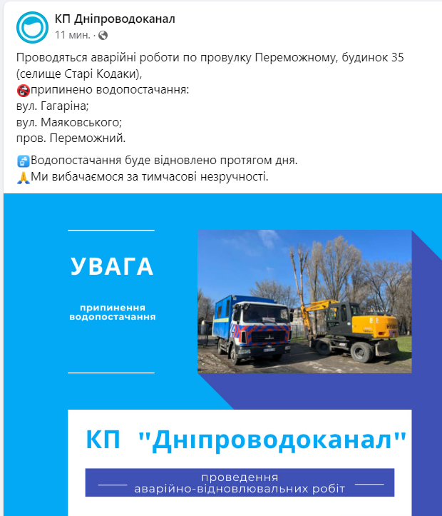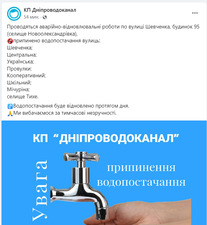 Так, у зв'язку з проведенням аварійно-відновлювальних робіт на вул. Шевченка, 95 (селище Новоолександрівка) та у пров. Переможному, 35 (селище Старі Кодаки) припинено водопостачання:
