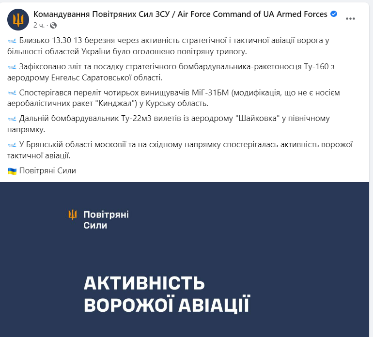 Близько 13.30 13 березня через активність стратегічної і тактичної авіації ворога у більшості областей України було оголошено повітряну тривогу. Зафіксовано зліт та посадку стратегічного бомбардувальника-ракетоносця Ту-160 з аеродрому Енгельс Саратовської області. Спостерігався переліт чотирьох винищувачів МіГ-31БМ (модифікація, що не є носієм аеробалістичних ракет "Кинджал") у Курську область. Дальній бомбардувальник Ту-22м3 вилетів із аеродрому "Шайковка" у північному напрямку. У Брянській області московії та на східному напрямку спостерігалась активність ворожої тактичної авіації, - йдеться у повідомленні Повітряних сил.