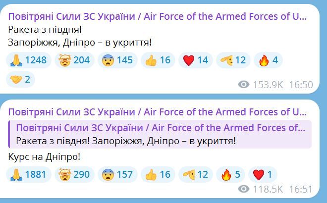 О 16:50 Повітряні сили ЗСУ в своєму телеграм-каналі повідомили про ракету, яка прямувала на Дніпро. До цього в області оголосили про повітряну тривогу та ракетну небезпеку. Через 20 хвилин пролунав відбій.