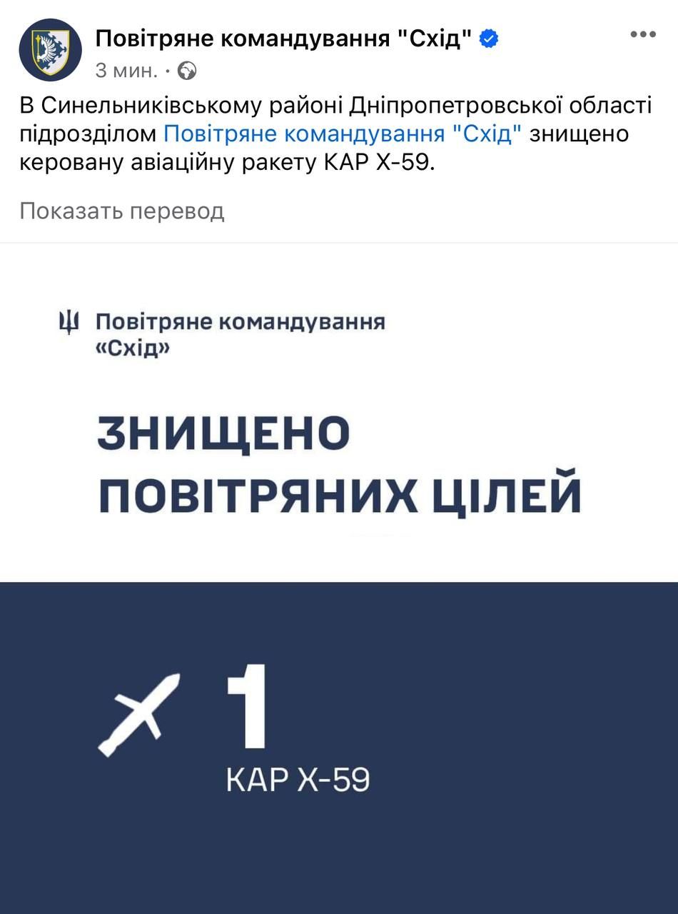 Як повідомили у Повітряному командуванні Схід, ракету, якою хотіли атакувати Дніпро, збили в Синельниківському районі. Це була крилата авіаційна ракета х-59.