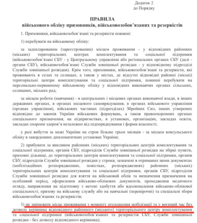 Норму про заборону зміни місця проживання передбачено Правилами військового обліку призовників, військовозобов’язаних та резервістів і закріплено в Додатку 2 до постанови Кабінету Міністрів України №1487 від 30 грудня 2022 року.