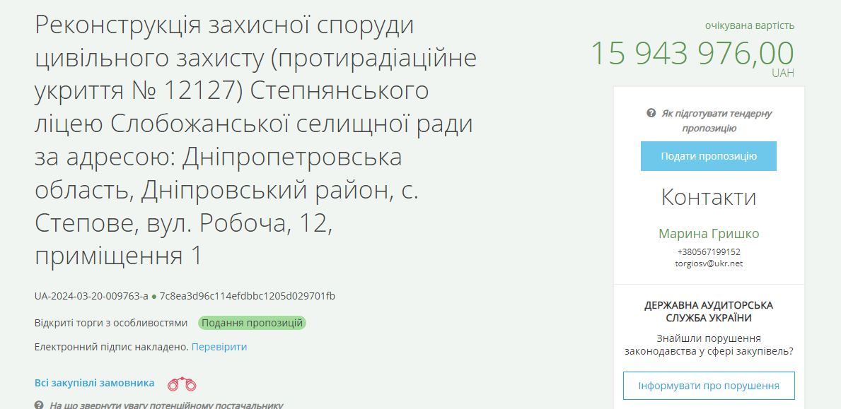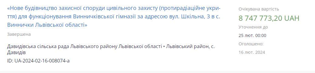 За ці кошти збираються реконструювати захисну споруду цивільного захисту, а саме протирадіаційне укриття у місцевому ліцеї. Такі дані зазначені у тендері, опублікованому на сайті держзакупівель Prozzoro.