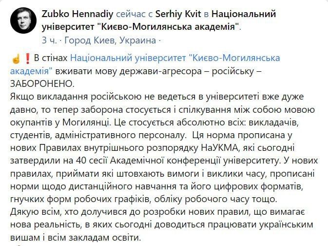 "Якщо викладання російською не ведеться в університеті вже дуже давно, то тепер заборона стосується і спілкування між собою мовою окупантів у Могилянці. Це стосується абсолютно всіх: викладачів, студентів, адміністративного персоналу", - прокоментував він.