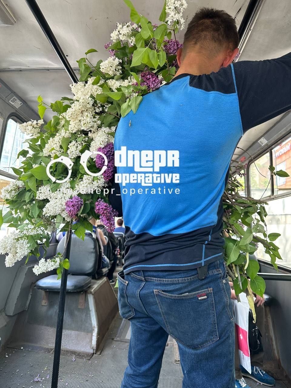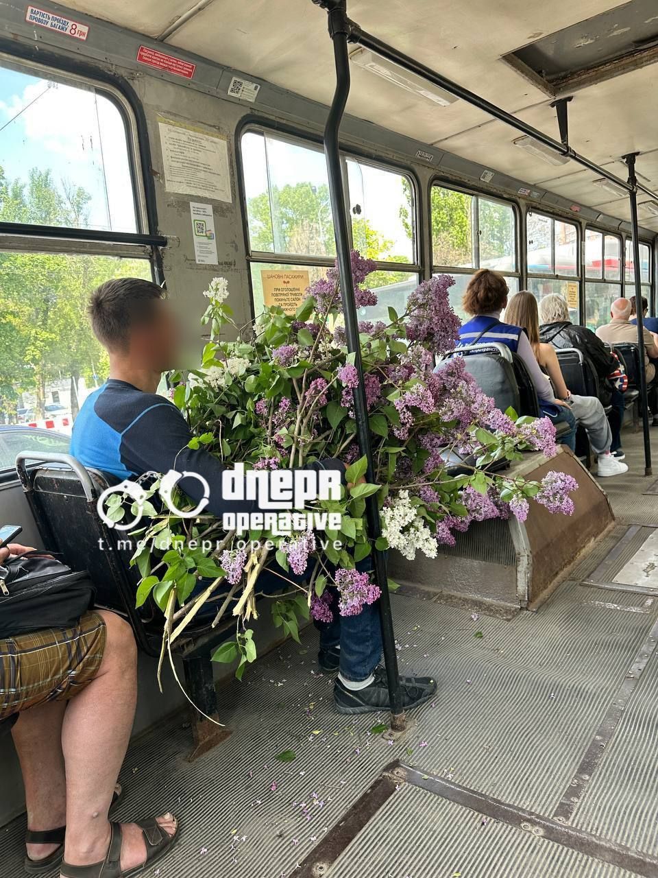 У трамваї в Дніпрі помітили пасажира, який віз своїй коханій цілий кущ бузку (ФОТО)