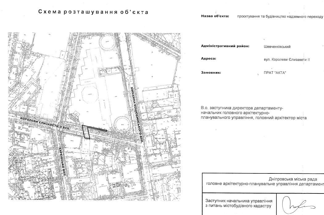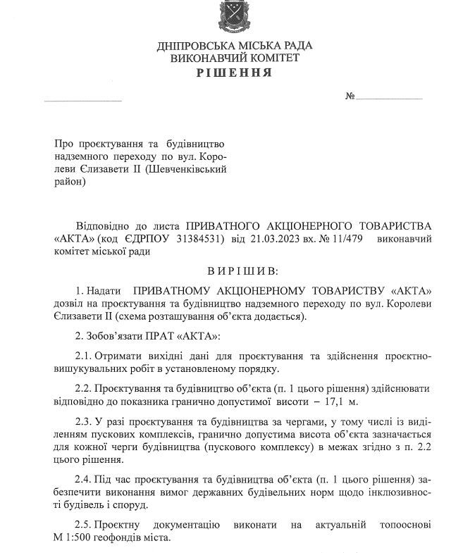 У документі йдеться, що будівництвом переходу займеться приватна компанія "АКТА", яка має перед початком робіт узгодити проєкт та виконати всі вимоги. До прикладу, гранично допустима висота переходу – 17,1 метра та він має бути інклюзивним.