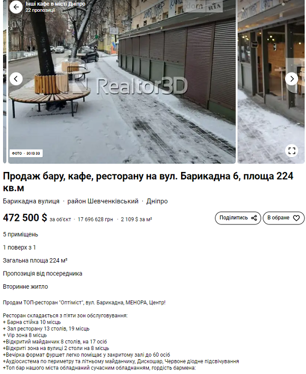 У Дніпрі на вулиці Барикадній продається ресторан. Відкрили його у 2020 році. Хочуть за заклад 17,6 млн грн або 472,5 тис дол.
