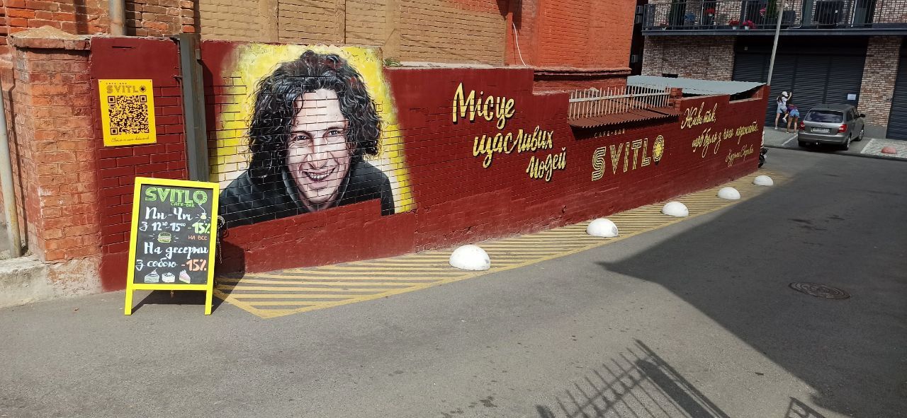 На ньому - портрет Кузьми Скрябіна та напис “Місце щасливих людей”. А також цитата самого Кузьми: "Живи так, щоб було з чого поржати".