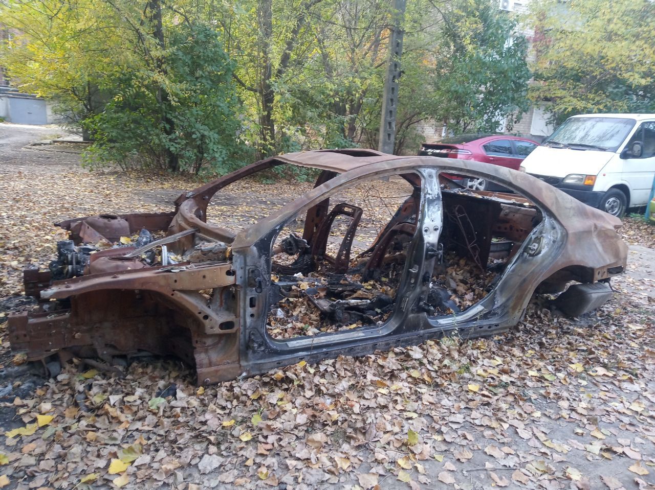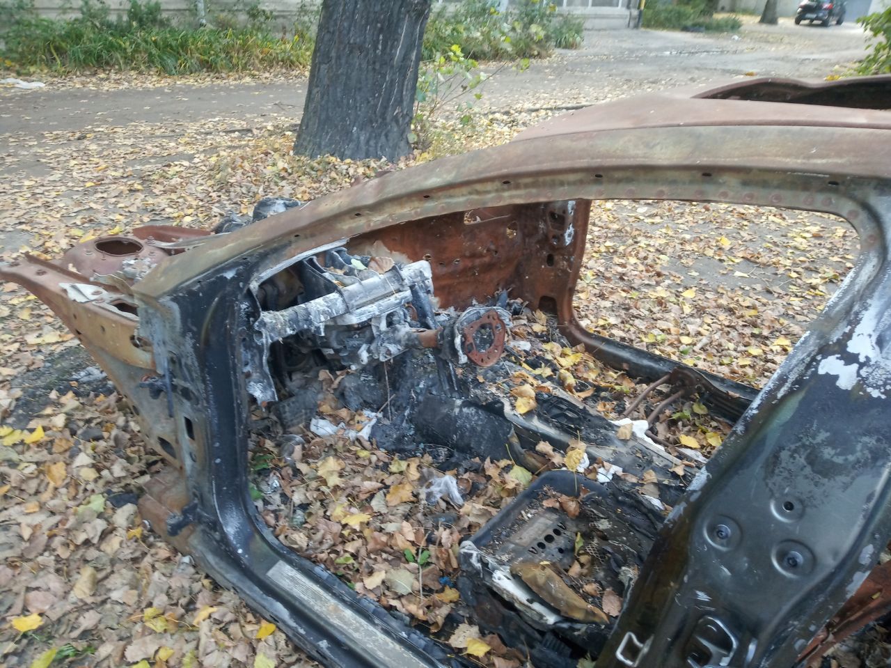 Згоріла автівка стоїть посеред двору, біля інших припаркованих машин. Передісторію знищеного транспорту ніхто не знає, але відомо, що стоїть він тут не день, не місяць, а декілька років.
