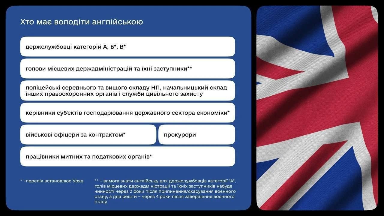 Знати англійську повинні держслужбовці категорій А, Б, В - це очільники обласних адміністрацій, їхні заступники, керівники суб'єктів господарювання держсектору, керівний склад поліції тощо. Тобто всі українці, які претендують на високі державні посади.