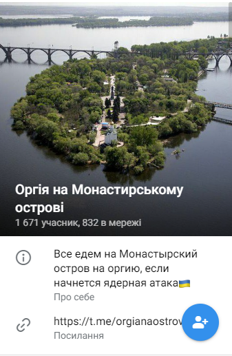 У Дніпрі не пасуть заднього і вже підготували відповідь Києву. Так, у разі ядерного удару містянам пропонують зібратися на Монастирському острові і влаштувати там свою оргію. Відповідний канал з'явився в Телеграм. Він уже налічує 1671 учасника. У описі сказано: "Усі їдемо на Монастирський острів на оргію, якщо почнеться ядерна атака".