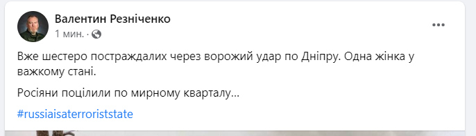 Як повідомив Валентин Резніченко, голова Дніпропетровської ОВА, уже відомо про 6 потерпілих.