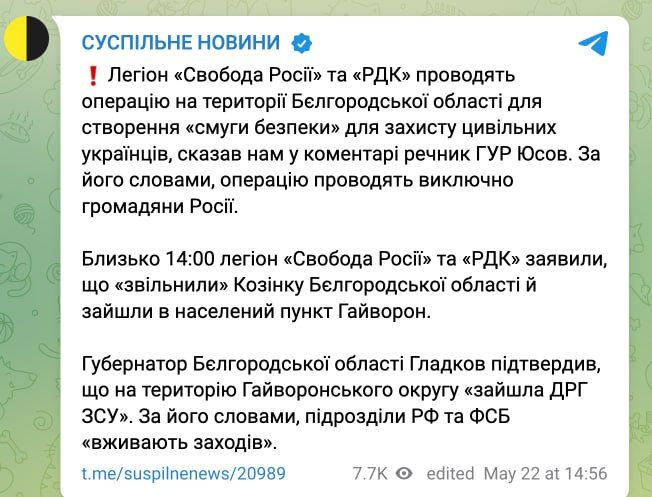 Тим часом легіон "Свобода Росії", який воює на боці України, записав відеозвернення із закликом до росіян боротися за вільну від путіна росію. Згодом легіон повідомив про звільнення населеного пункту у Бєлгородської області. Там заявили, що "Свобода Росії" та РДК "рухаються далі".