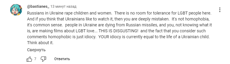 Росіяни в Україні ґвалтують дітей і жінок. Тут немає місця толерантності до ЛГБТ. І якщо ви думаєте, що українці люблять це дивитися, то ви глибоко помиляєтеся. Це не гомофобія, це здоровий глузд. люди в Україні гинуть від російських ракет, а ви не знаючи що це таке, знімаєте фільми про ЛГБТ кохання... ЦЕ ОГИДНО! А те, що ви вважаєте такі коментарі гомофобними - це просто ідіотизм. ВАШ ідіотизм наразі дорівнює життю української дитини. Подумайте над цим.