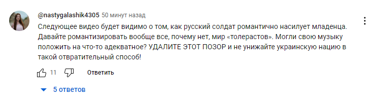 Следующее видео будет видимо о том, как русский солдат романтично насилует младенца. Давайте романтизировать вообще все, почему нет, мир «толерастов». Могли свою музыку положить на что-то адекватное? УДАЛИТЕ ЭТОТ ПОЗОР и не унижайте украинскую нацию в такой отвратительный способ!