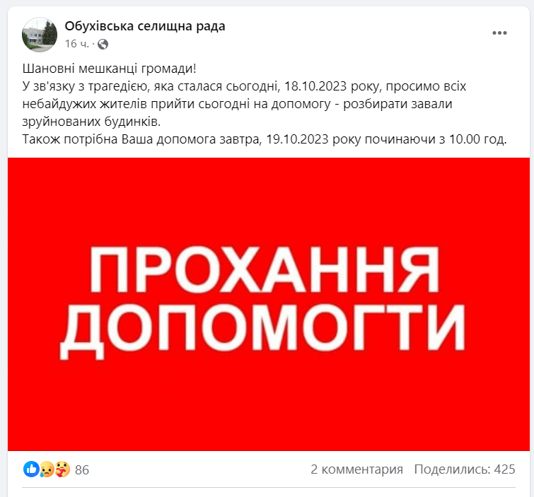У зв'язку з трагедією, яка сталася 18.10.2023 року, просимо всіх небайдужих жителів прийти сьогодні на допомогу - розбирати завали зруйнованих будинків. Також потрібна Ваша допомога 19.10.2023 року, починаючи з 10:00, - йдеться у повідомленні.