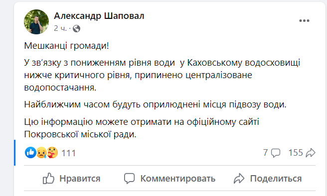 Мешканці громади! У зв’язку з пониженням рівня води у Каховському водосховищі нижче критичного рівня припинено централізоване водопостачання, - написав він.