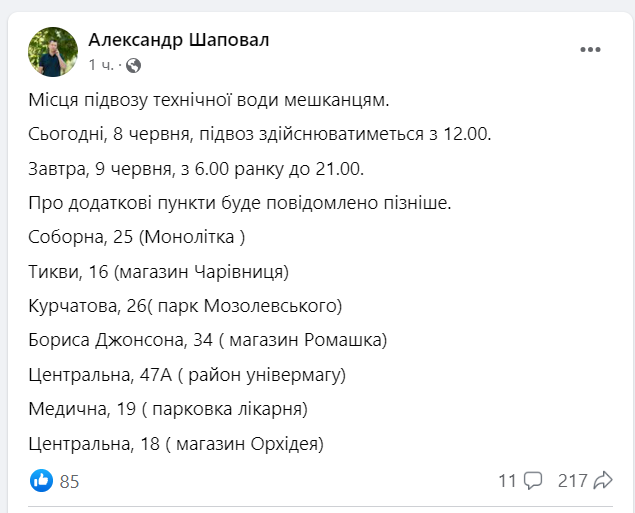 Та опублікував адреси місць підвозу технічної води мешканцям: