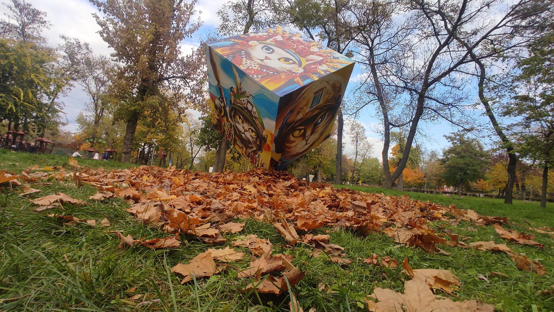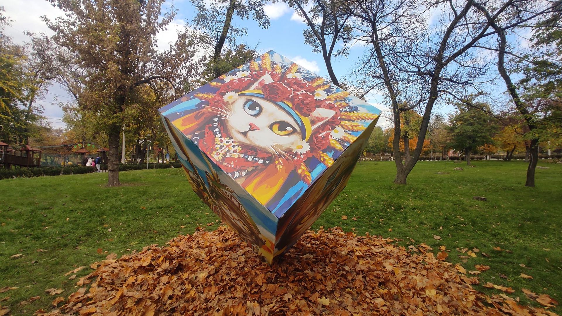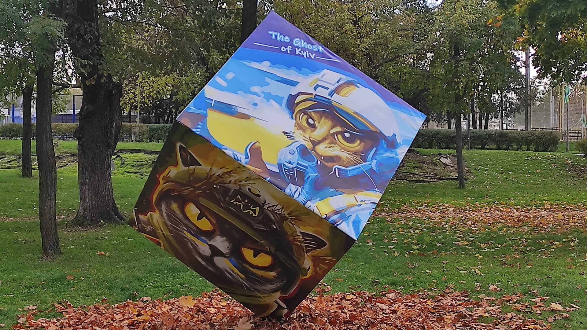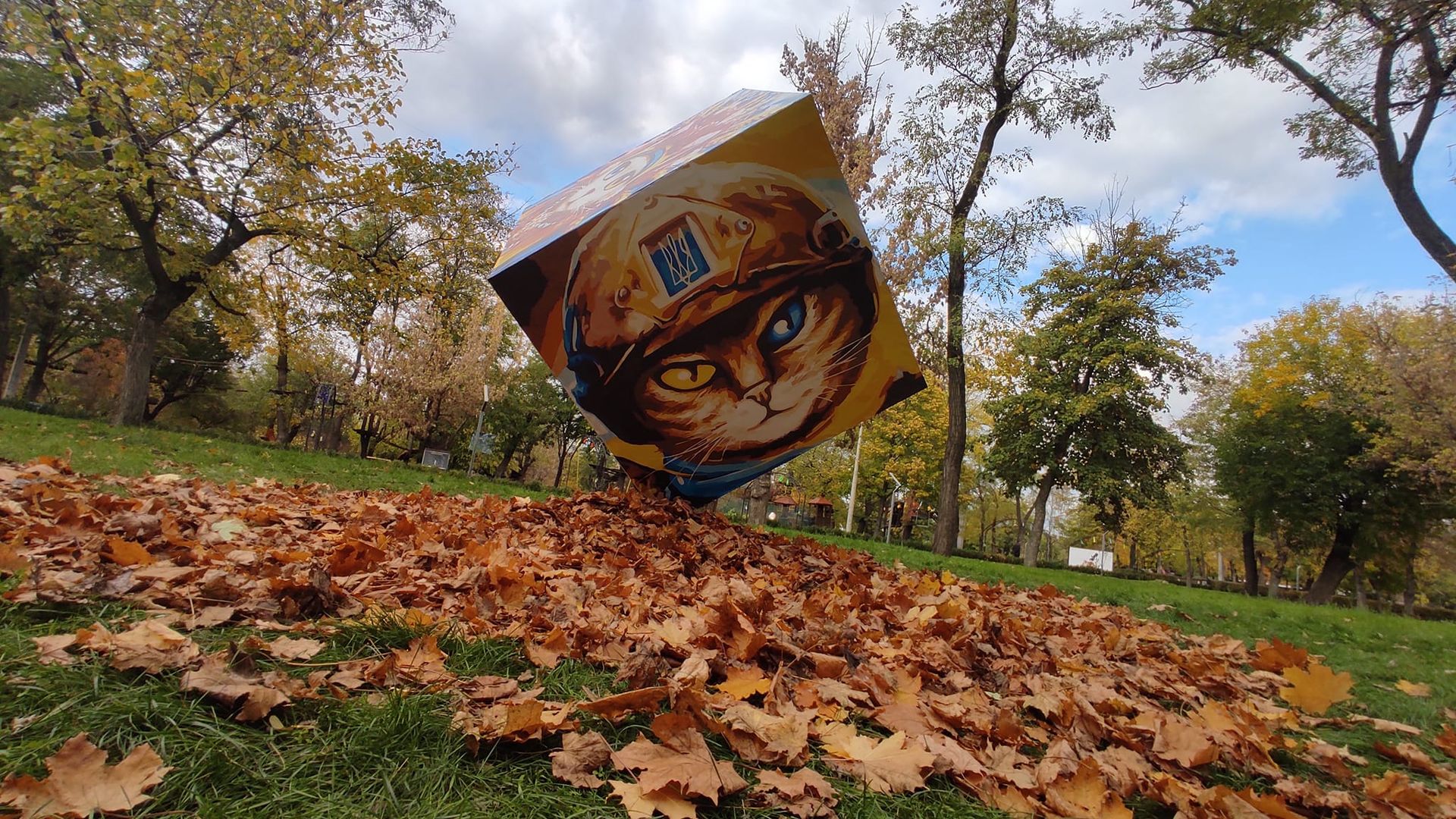 На кожній грані гігантського куба - малюнки відомих котиків-захисниць та захисників. Приурочили арт-інсталяцію саме до свята на честь наших воїнів.