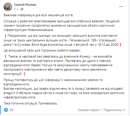 Від сьогодні ми вимушені залишити вуличне освітлення лише на трьох центральних вулицях міста - Гетьманській, 195-ї стрілецької дивізії та Сучкова. Воно буде вмикатись лише у вечірній час з 16:10 до 20:00, - написав він.