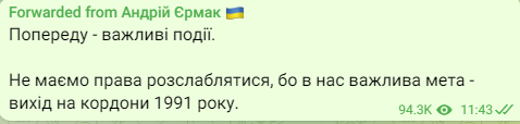 Попереду - важливі події. Не маємо права розслаблятися, бо в нас важлива мета - вихід на кордони 1991 року, - написав Андрій Єрмак, голова ОП.