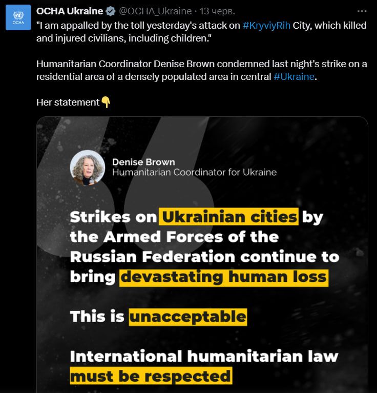 "Я приголомшена численними жертвами вчорашньої атаки на місто Кривий Ріг, у результаті якої загинули та були поранені мирні жителі, включно з дітьми. Удари Збройних сил РФ по українських містах продовжують приносити величезні людські втрати. Це неприпустимо. Слід поважати міжнародне гуманітарне право", - йдеться у пості Деніз Браун у мережі Х.