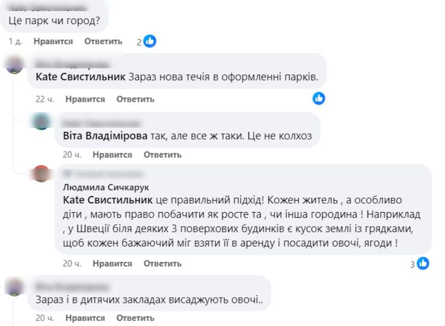 У коментарях під дописом деякі мешканці обурюються ти, що песеред міста з’являється все більше грядок з овочами замість клумб. Однак є і ті, хто каже, що це правильний підхід і дітям буде цікаво побачити, як ростуть городні рослини. А дехто навіть жартує, що зараз нова течія в оформленні парків.