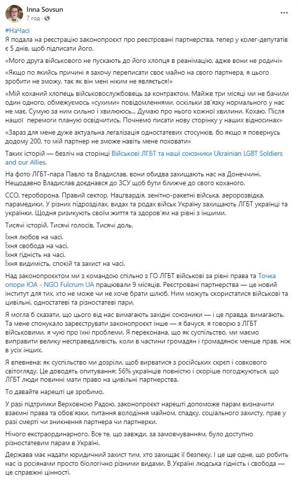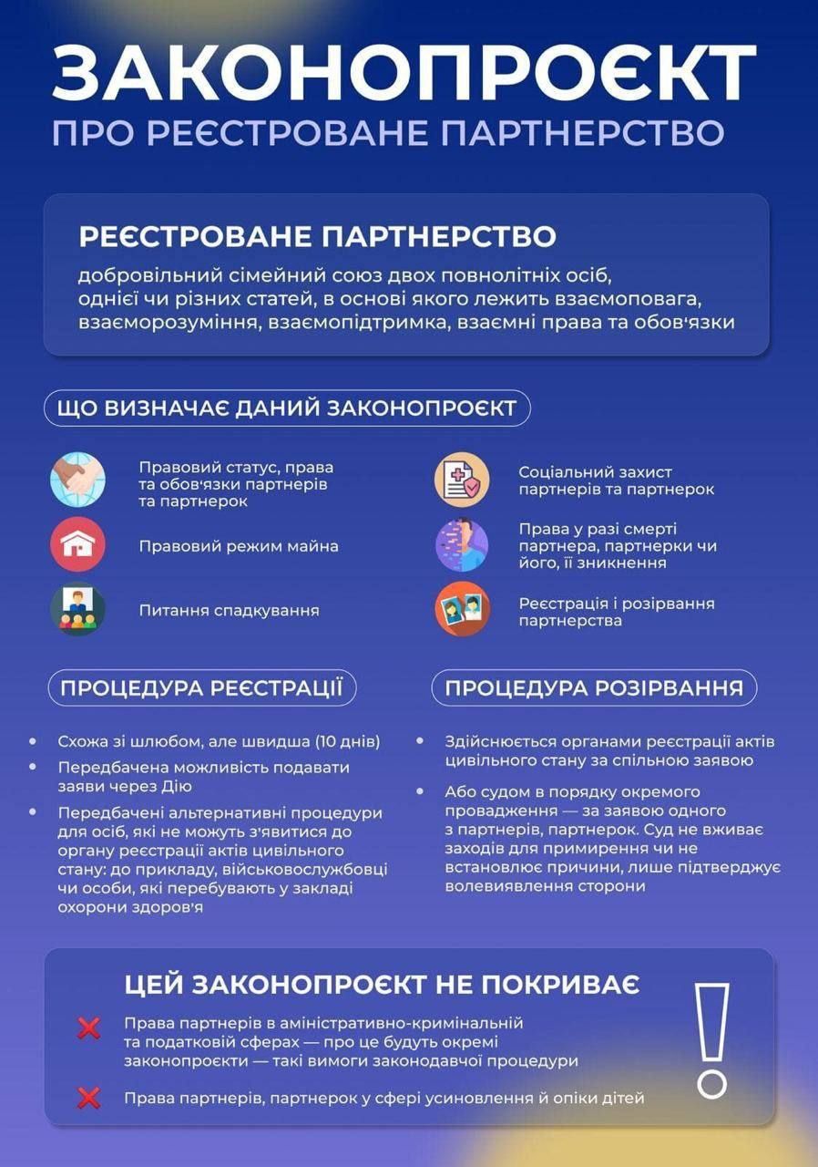 Законопроєкт допоможе одностатевим парам визначити взаємні права та обов'язки, питання володіння майном, спадку, соціального захисту, прав у разі смерті чи зникнення партнера / партнерки, – повідомила народна депутатка.