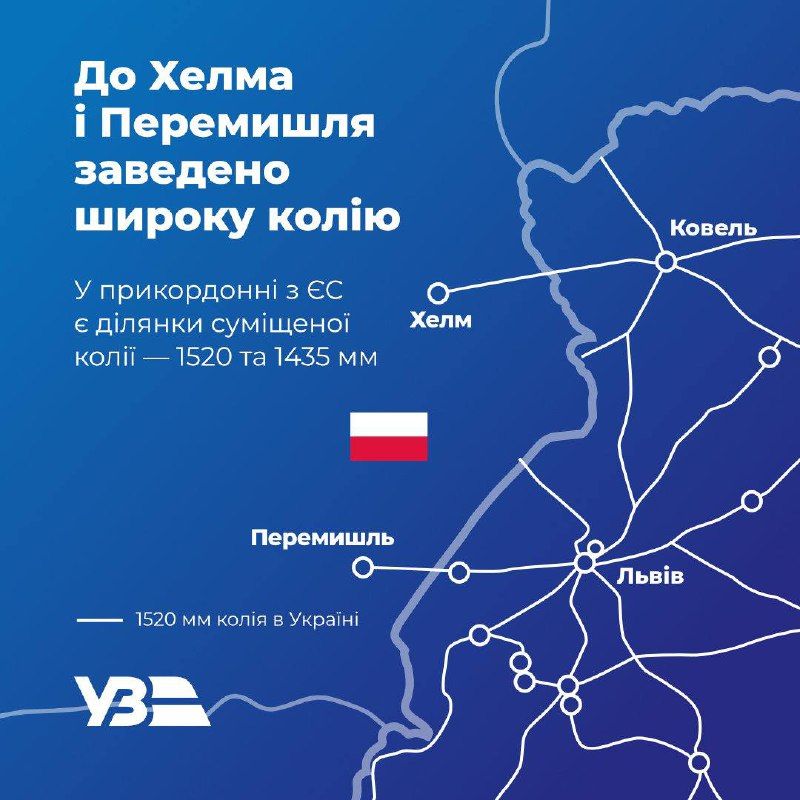 У прикордонні з ЄС є ділянки суміщеної колії — 1520 та 1435 мм, де можуть рухатися поїзди двох стандартів. А до Хелма і Перемишля, куди потяги з України курсують щодня, заведено широку колію.