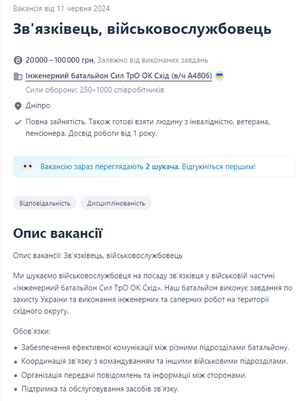 ЗСУ шукають військовослужбовця-зв'язківця. Місце роботи – інженерний батальйон. Все, що потрібно від претендента – рік досвіду роботи. Зарплата від 20 до 100 тис грн. До обов'язків входить забезпечення ефективної комунікації між різними підрозділами батальйону, координація зв'язку з командуванням та іншими підрозділами, підтримка та обслуговування засобів зв'язку.