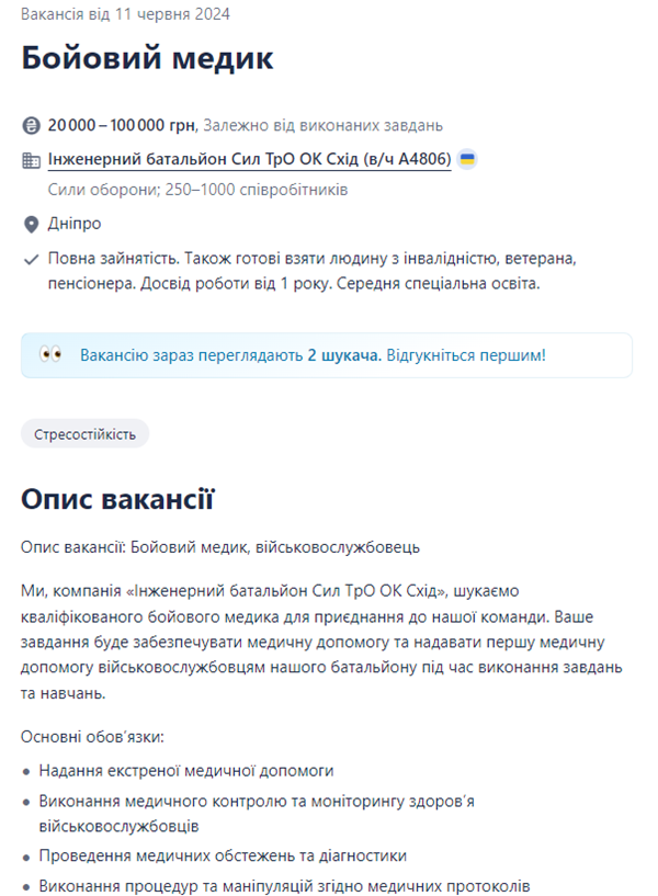 Також цей батальйон потрібен бойовий медик. Від претендента необхідна середня спеціальна освіта та досвід роботи від року. До обов'язків співробітника входитиме забезпечення медичної допомоги та перша допомога при виконанні завдань та під час навчання.