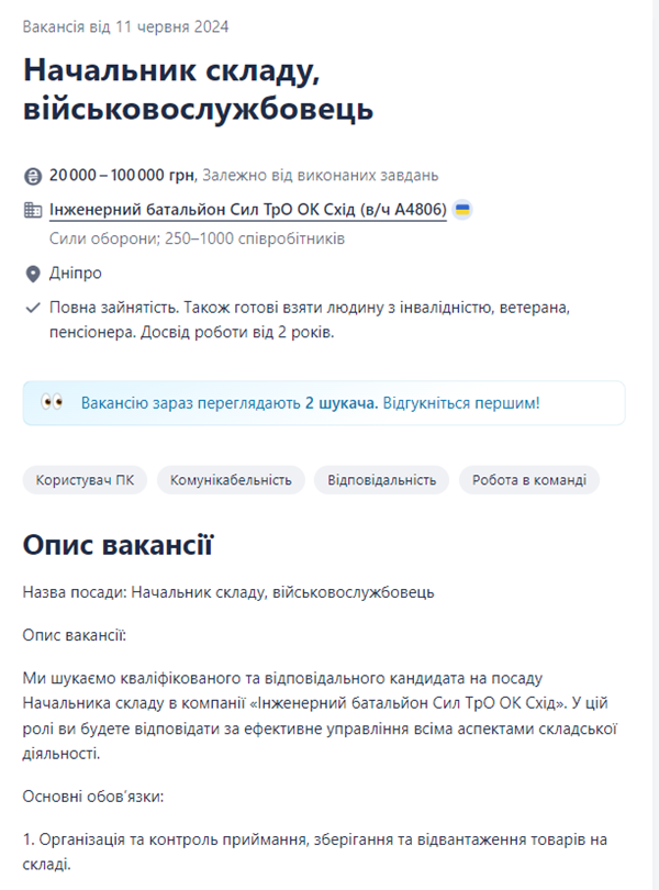 Також в інженерний батальйон потрібний начальник складу. Готові взяти людину з інвалідністю, ветерана, пенсіонера, потрібний досвід роботи від 2-х років. Майбутній співробітник відповідатиме за ефективне керування всіма аспектами складської діяльності.