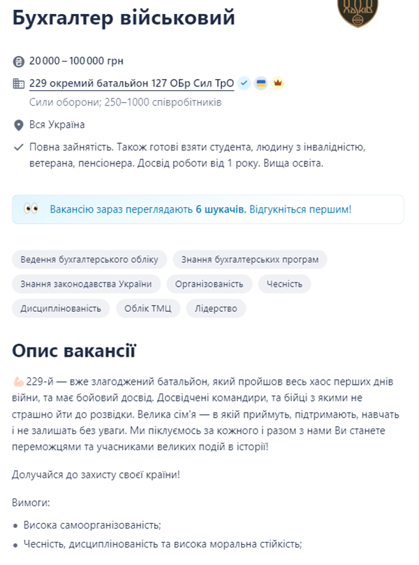 Військовий бухгалтер, працюючи в окремому батальйоні, може заробити від 20 до 100 тис грн. Від претендента потрібна вища освіта та рік досвіду роботи. Серед вимог також висока самоорганізованість, чесність, дисциплінованість, відсутність алкогольної залежності.