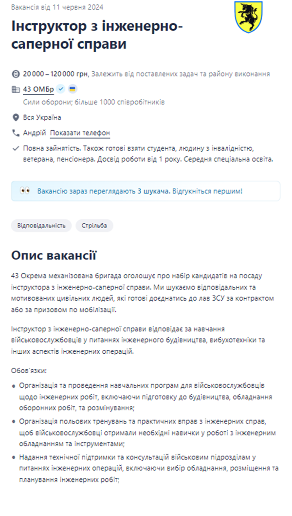 В окрему механізовану бригаду потрібен інструктор з інженерно-саперної справи. Зарплата від 40 до 120 тис. грн. До його обов'язків входитиме організація та проведення навчальних програм для військовослужбовців щодо проведення інженерних робіт, включаючи підготовку до будівництва та розмінування. Організація польових тренувань та практичних вправ, надання технічної підтримки та консультації військовим підрозділам у питаннях інженерних операцій.