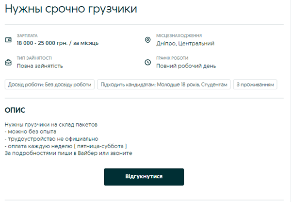 Терміново шукають у Дніпрі вантажників. Підходять люди як з досвідом роботи так і без, працювати потрібно буде повний робочий день. Платити обіцяють від 18 до 25 тис грн на місяць.