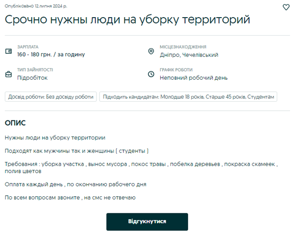 Терміново потрібен у Дніпрі співробітник, який прибиратиме територію. Зарплата від 160 до 180 грн за годину. Потрібно буде прибирати ділянку, виносити сміття, косити траву, білити дерева, фарбувати лавки та поливати квіти. Оплата щодня після закінчення робочого дня.