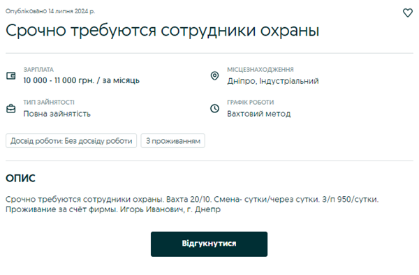 У Дніпрі терміново потрібні співробітники охорони. Працювати потрібно вахтовим методом 20/10. Зміна – доба за добу. Зарплата за одну зміну – 950 грн.
