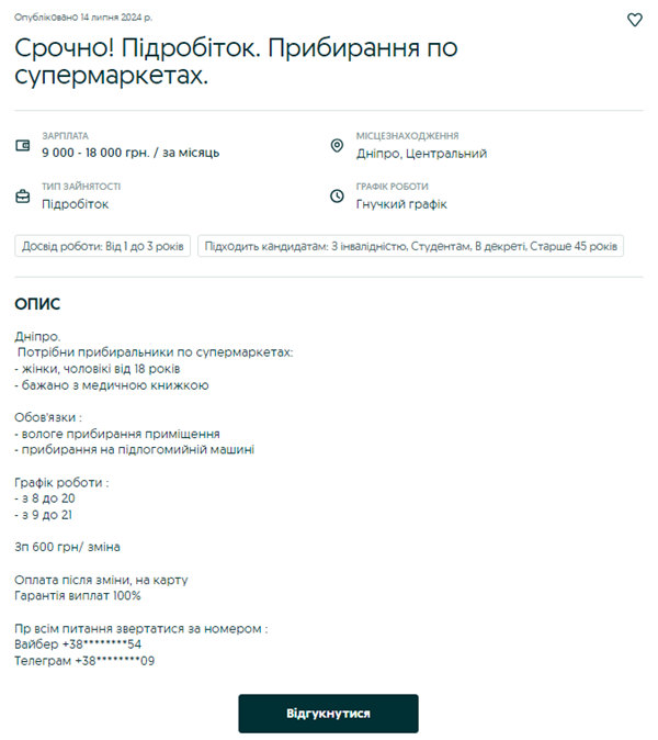 Терміново шукають у Дніпрі співробітників для прибирання у супермаркетах міста. Платити обіцяють від 9 до 18 тис. грн на місяць або 600 грн за зміну. Гнучкий графік роботи, бажано мати при собі медичну книжку. До обов'язків входить вологе прибирання приміщення та прибирання за допомогою підлогомийної машини. Графік з 8 до 20 чи з 9 до 21.