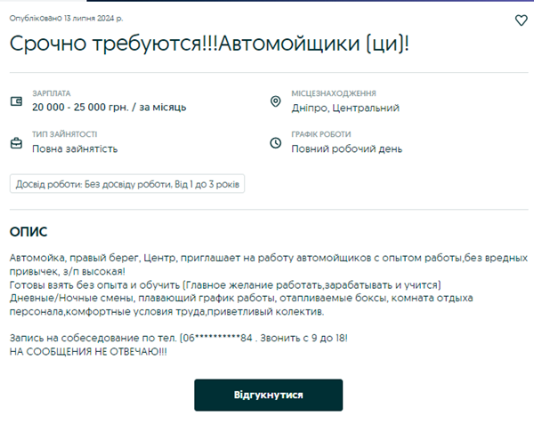 У Дніпрі терміново шукають співробітника чи співробітницю для роботи на автомийці. Платити обіцяють від 20 до 25 тис грн на місяць. Бажаний досвід роботи, але якщо його немає, а бажання працювати у сфері є готові навчити всім премудростям. Є денні та нічні зміни, плаваючий графік роботи. На мийці є кімната відпочинку для персоналу, в зимовий час бокси опалюються.
