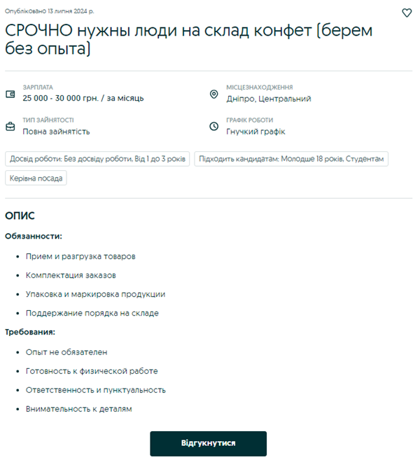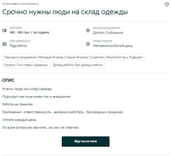 У Дніпрі терміново потрібні співробітники на склад одягу. Платити обіцяють від 140 до 160 грн. за годину роботи. Серед вимог: відповідальність, бажання працювати та відсутність шкідливих звичок.