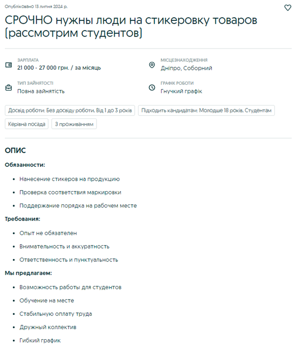 Для стікерування товарів у Дніпрі терміново потрібні співробітники. Головне завдання – наносити стікери на готову продукцію, перевіряти відповідність маркування та підтримувати порядок на робочому місці. Досвід роботи не обов'язковий, головне – уважність та акуратність, відповідальність та пунктуальність. Платити обіцяють від 21 до 27 тис. грн на місяць.