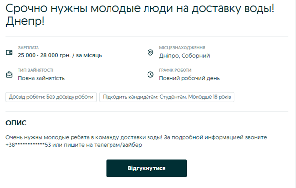 В один із магазинів Дніпра терміново потрібен співробітник на посаду продавця. Зарплата від 900 грн. на день. Таким чином, на місяць можна заробити від 13 до 17 тис грн. Подробиці обіцяють повідомити телефоном.